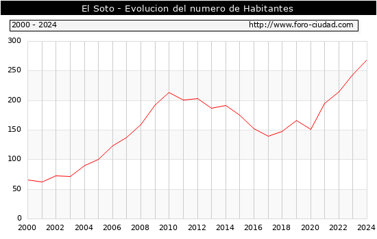 el numero de habitantes en El Soto era de 269, 26 habitantes mas que el en el año 2023. En el grafico siguiente se puede ver cuantos habitantes tiene El Soto a lo largo de los años.
