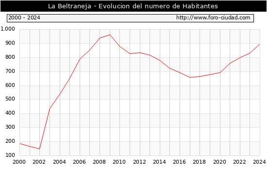el numero de habitantes en La Beltraneja era de 897, 67 habitantes mas que el en el año 2023. En el grafico siguiente se puede ver cuantos habitantes tiene La Beltraneja a lo largo de los años.