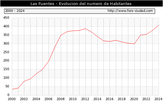 el numero de habitantes en Las Fuentes era de 408, 31 habitantes mas que el en el año 2023. En el grafico siguiente se puede ver cuantos habitantes tiene Las Fuentes a lo largo de los años.