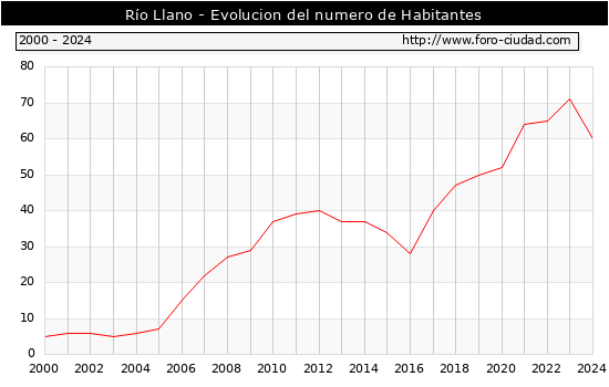 el numero de habitantes en Río Llano era de 60, 11 habitantes menos que el en el año 2023. En el grafico siguiente se puede ver cuantos habitantes tiene Río Llano a lo largo de los años.