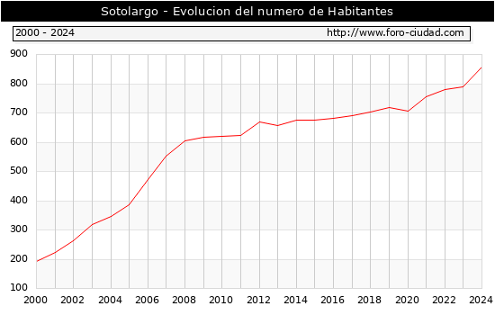 el numero de habitantes en Sotolargo era de 857, 67 habitantes mas que el en el año 2023. En el grafico siguiente se puede ver cuantos habitantes tiene Sotolargo a lo largo de los años.