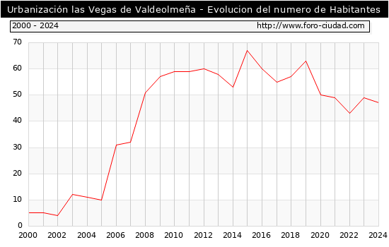 el numero de habitantes en Urbanización las Vegas de Valdeolmeña era de 47, 2 habitantes menos que el en el año 2023. En el grafico siguiente se puede ver cuantos habitantes tiene Urbanización las Vegas de Valdeolmeña a lo largo de los años.