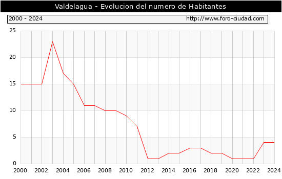 el numero de habitantes en Valdelagua era de 4, igual numero de habitantes que el en el año 2023. En el grafico siguiente se puede ver cuantos habitantes tiene Valdelagua a lo largo de los años.