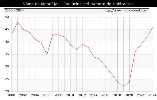 el numero de habitantes en Viana de Mondéjar era de 46, 4 habitantes mas que el en el año 2023. En el grafico siguiente se puede ver cuantos habitantes tiene Viana de Mondéjar a lo largo de los años.