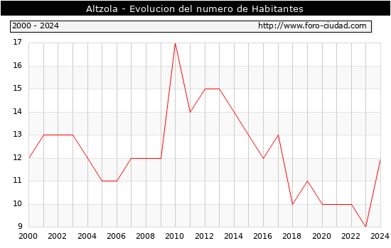 el numero de habitantes en Altzola era de 12, 3 habitantes mas que el en el año 2023. En el grafico siguiente se puede ver cuantos habitantes tiene Altzola a lo largo de los años.