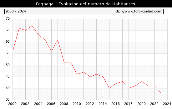 el numero de habitantes en Pagoaga era de 38, igual numero de habitantes que el en el año 2023. En el grafico siguiente se puede ver cuantos habitantes tiene Pagoaga a lo largo de los años.