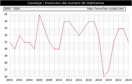 el numero de habitantes en Canaleja era de 31, 2 habitantes menos que el en el año 2023. En el grafico siguiente se puede ver cuantos habitantes tiene Canaleja a lo largo de los años.
