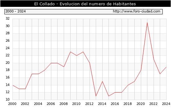 el numero de habitantes en El Collado era de 19, 2 habitantes mas que el en el año 2023. En el grafico siguiente se puede ver cuantos habitantes tiene El Collado a lo largo de los años.