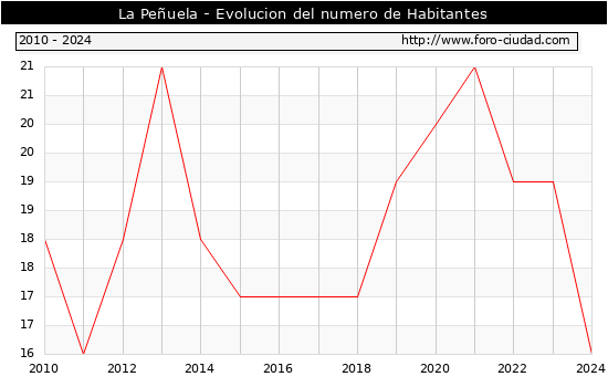 Segun los datos publicados por el INE a 1 de Enero de 2024 el numero de habitantes en La Peñuela era de 16, 3 habitantes menos que el en el año 2023. En el grafico siguiente se puede ver cuantos habitantes tiene La Peñuela a lo largo de los años.