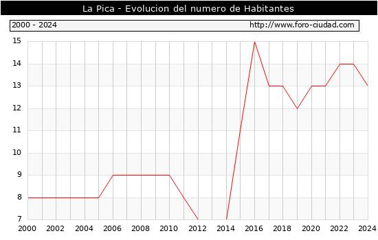 Segun los datos publicados por el INE a 1 de Enero de 2024 el numero de habitantes en La Pica era de 13, 1 habitantes menos que el en el año 2023. En el grafico siguiente se puede ver cuantos habitantes tiene La Pica a lo largo de los años.