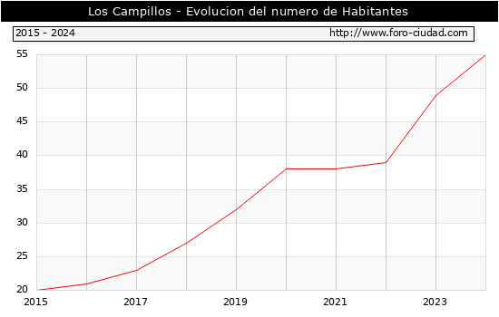 el numero de habitantes en Los Campillos era de 55, 6 habitantes mas que el en el año 2023. En el grafico siguiente se puede ver cuantos habitantes tiene Los Campillos a lo largo de los años.