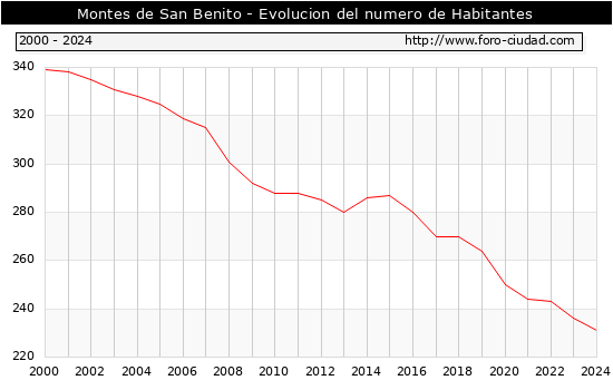 el numero de habitantes en Montes de San Benito era de 231, 5 habitantes menos que el en el año 2023. En el grafico siguiente se puede ver cuantos habitantes tiene Montes de San Benito a lo largo de los años.