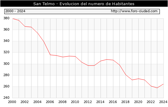 el numero de habitantes en San Telmo era de 265, 7 habitantes mas que el en el año 2023. En el grafico siguiente se puede ver cuantos habitantes tiene San Telmo a lo largo de los años.
