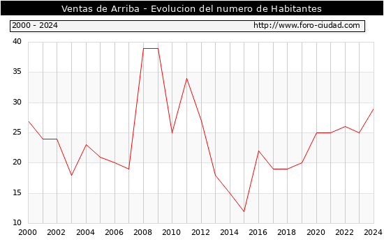 el numero de habitantes en Ventas de Arriba era de 29, 4 habitantes mas que el en el año 2023. En el grafico siguiente se puede ver cuantos habitantes tiene Ventas de Arriba a lo largo de los años.