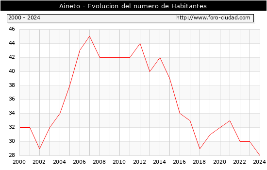 el numero de habitantes en Aineto era de 28, 2 habitantes menos que el en el año 2023. En el grafico siguiente se puede ver cuantos habitantes tiene Aineto a lo largo de los años.