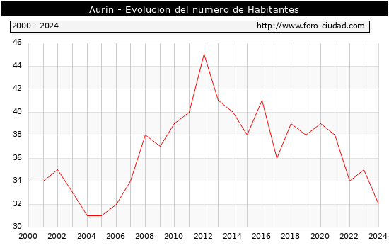 el numero de habitantes en Aurín era de 32, 3 habitantes menos que el en el año 2023. En el grafico siguiente se puede ver cuantos habitantes tiene Aurín a lo largo de los años.
