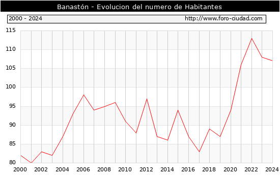 el numero de habitantes en Banastón era de 107, 1 habitantes menos que el en el año 2023. En el grafico siguiente se puede ver cuantos habitantes tiene Banastón a lo largo de los años.