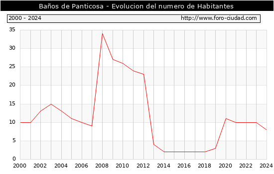 el numero de habitantes en Baños de Panticosa era de 8, 2 habitantes menos que el en el año 2023. En el grafico siguiente se puede ver cuantos habitantes tiene Baños de Panticosa a lo largo de los años.