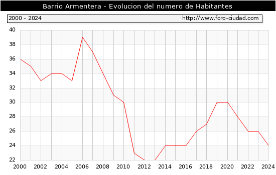 el numero de habitantes en Barrio Armentera era de 24, 2 habitantes menos que el en el año 2023. En el grafico siguiente se puede ver cuantos habitantes tiene Barrio Armentera a lo largo de los años.