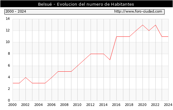el numero de habitantes en Belsué era de 11, igual numero de habitantes que el en el año 2023. En el grafico siguiente se puede ver cuantos habitantes tiene Belsué a lo largo de los años.