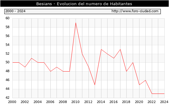 el numero de habitantes en Besians era de 43, igual numero de habitantes que el en el año 2023. En el grafico siguiente se puede ver cuantos habitantes tiene Besians a lo largo de los años.