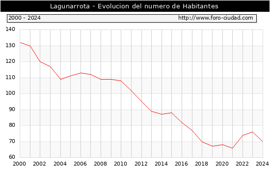 el numero de habitantes en Lagunarrota era de 70, 6 habitantes menos que el en el año 2023. En el grafico siguiente se puede ver cuantos habitantes tiene Lagunarrota a lo largo de los años.