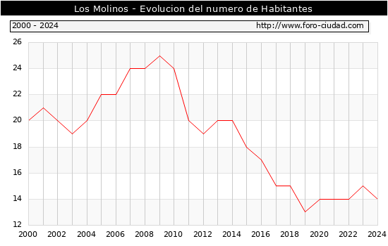 el numero de habitantes en Los Molinos era de 14, 1 habitantes menos que el en el año 2023. En el grafico siguiente se puede ver cuantos habitantes tiene Los Molinos a lo largo de los años.