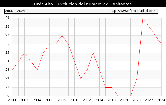 el numero de habitantes en Orós Alto era de 26, 1 habitantes menos que el en el año 2023. En el grafico siguiente se puede ver cuantos habitantes tiene Orós Alto a lo largo de los años.