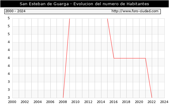 el numero de habitantes en San Esteban de Guarga era de 3, igual numero de habitantes que el en el año 2023. En el grafico siguiente se puede ver cuantos habitantes tiene San Esteban de Guarga a lo largo de los años.
