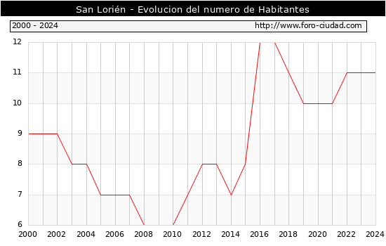 el numero de habitantes en San Lorién era de 11, igual numero de habitantes que el en el año 2023. En el grafico siguiente se puede ver cuantos habitantes tiene San Lorién a lo largo de los años.