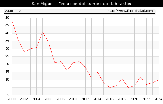 Segun los datos publicados por el INE a 1 de Enero de 2024 el numero de habitantes en San Miguel era de 10, 2 habitantes mas que el en el año 2023. En el grafico siguiente se puede ver cuantos habitantes tiene San Miguel a lo largo de los años.