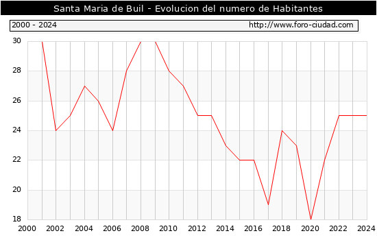 el numero de habitantes en Santa Maria de Buil era de 25, igual numero de habitantes que el en el año 2023. En el grafico siguiente se puede ver cuantos habitantes tiene Santa Maria de Buil a lo largo de los años.