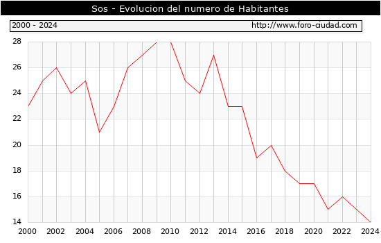 el numero de habitantes en Sos era de 14, 1 habitantes menos que el en el año 2023. En el grafico siguiente se puede ver cuantos habitantes tiene Sos a lo largo de los años.