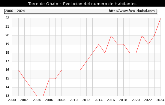 el numero de habitantes en Torre de Obato era de 22, 2 habitantes mas que el en el año 2023. En el grafico siguiente se puede ver cuantos habitantes tiene Torre de Obato a lo largo de los años.