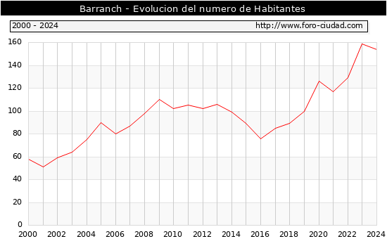 el numero de habitantes en Barranch era de 154, 5 habitantes menos que el en el año 2023. En el grafico siguiente se puede ver cuantos habitantes tiene Barranch a lo largo de los años.