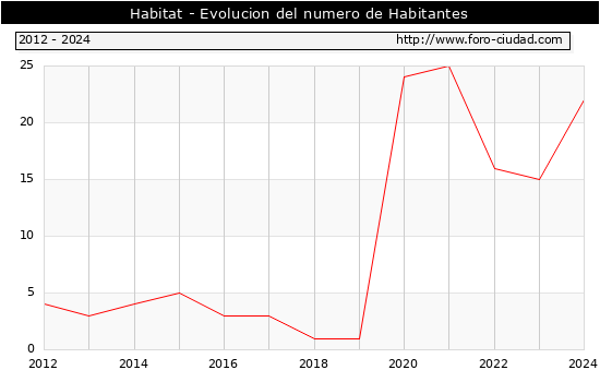el numero de habitantes en Habitat era de 22, 7 habitantes mas que el en el año 2023. En el grafico siguiente se puede ver cuantos habitantes tiene Habitat a lo largo de los años.