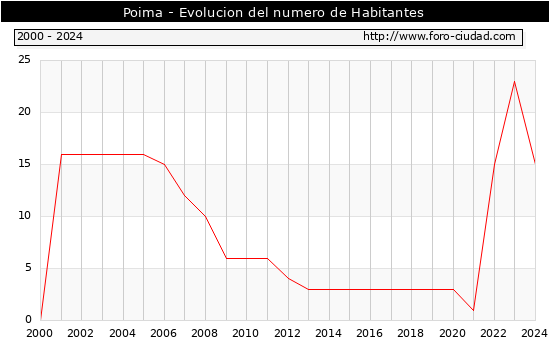 el numero de habitantes en Poima era de 15, 8 habitantes menos que el en el año 2023. En el grafico siguiente se puede ver cuantos habitantes tiene Poima a lo largo de los años.