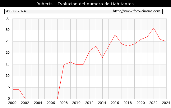 el numero de habitantes en Ruberts era de 25, 1 habitantes menos que el en el año 2023. En el grafico siguiente se puede ver cuantos habitantes tiene Ruberts a lo largo de los años.