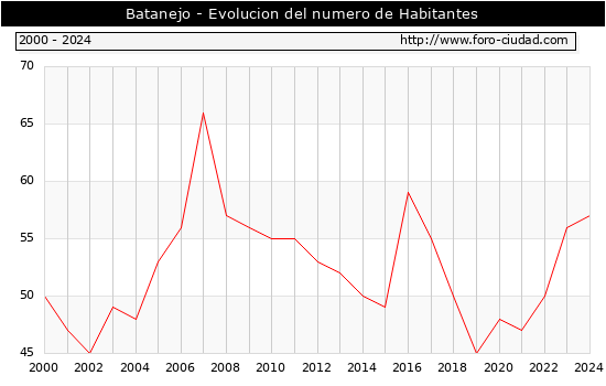 el numero de habitantes en Batanejo era de 57, 1 habitantes mas que el en el año 2023. En el grafico siguiente se puede ver cuantos habitantes tiene Batanejo a lo largo de los años.