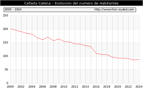 el numero de habitantes en Cañada Catena era de 88, 1 habitantes mas que el en el año 2023. En el grafico siguiente se puede ver cuantos habitantes tiene Cañada Catena a lo largo de los años.