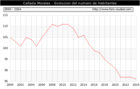 el numero de habitantes en Cañada Morales era de 86, 1 habitantes menos que el en el año 2023. En el grafico siguiente se puede ver cuantos habitantes tiene Cañada Morales a lo largo de los años.
