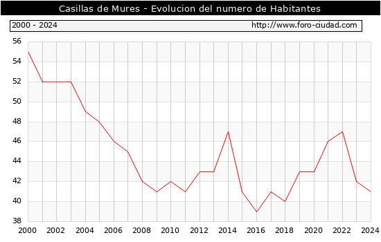 el numero de habitantes en Casillas de Mures era de 41, 1 habitantes menos que el en el año 2023. En el grafico siguiente se puede ver cuantos habitantes tiene Casillas de Mures a lo largo de los años.