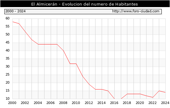 el numero de habitantes en El Almicerán era de 14, 1 habitantes menos que el en el año 2023. En el grafico siguiente se puede ver cuantos habitantes tiene El Almicerán a lo largo de los años.