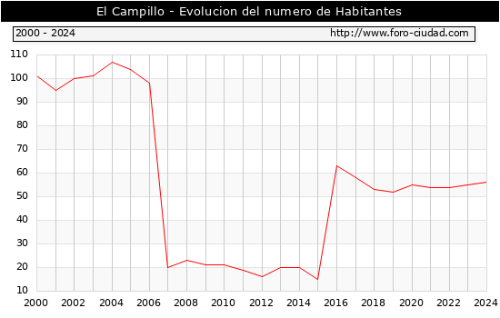 el numero de habitantes en El Campillo era de 56, 1 habitantes mas que el en el año 2023. En el grafico siguiente se puede ver cuantos habitantes tiene El Campillo a lo largo de los años.
