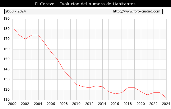 el numero de habitantes en El Cerezo era de 112, 5 habitantes menos que el en el año 2023. En el grafico siguiente se puede ver cuantos habitantes tiene El Cerezo a lo largo de los años.