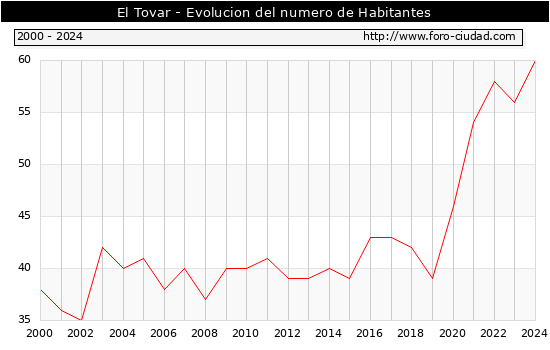 el numero de habitantes en El Tovar era de 60, 4 habitantes mas que el en el año 2023. En el grafico siguiente se puede ver cuantos habitantes tiene El Tovar a lo largo de los años.