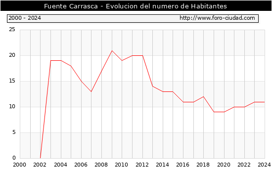 el numero de habitantes en Fuente Carrasca era de 11, igual numero de habitantes que el en el año 2023. En el grafico siguiente se puede ver cuantos habitantes tiene Fuente Carrasca a lo largo de los años.