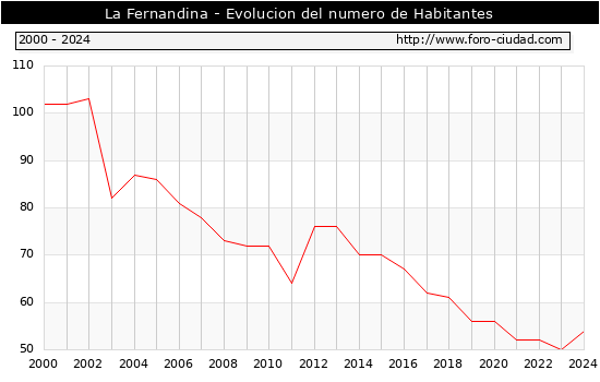 Segun los datos publicados por el INE a 1 de Enero de 2024 el numero de habitantes en La Fernandina era de 54, 4 habitantes mas que el en el año 2023. En el grafico siguiente se puede ver cuantos habitantes tiene La Fernandina a lo largo de los años.
