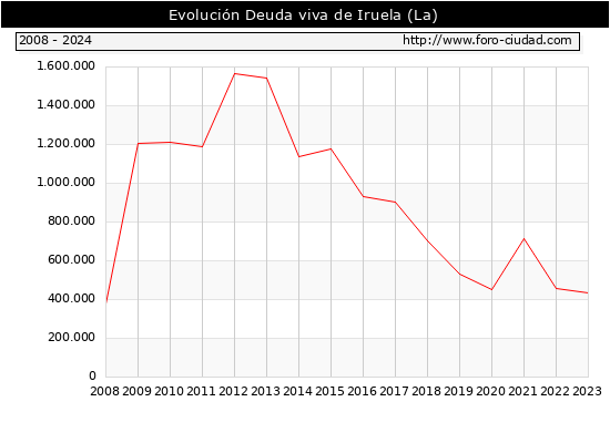 La Iruela - Deuda viva del Ayuntamiento a 31/12/2024 La Iruela - Deuda viva del Ayuntamiento a 31/12/2024 Segun el Ministerio de Economia y Hacienda el Ayuntamiento de La Iruela a 31/12/2024 posee una deuda de 498.000 € . La deuda viva a 31/12/2023 ascendia a 433.000 € por lo que en el ultimo año la deuda crecio en 65.000 €. ![]()