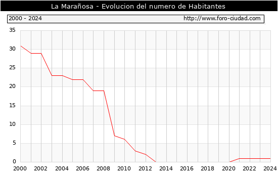 el numero de habitantes en La Marañosa era de 1, igual numero de habitantes que el en el año 2023. En el grafico siguiente se puede ver cuantos habitantes tiene La Marañosa a lo largo de los años.
